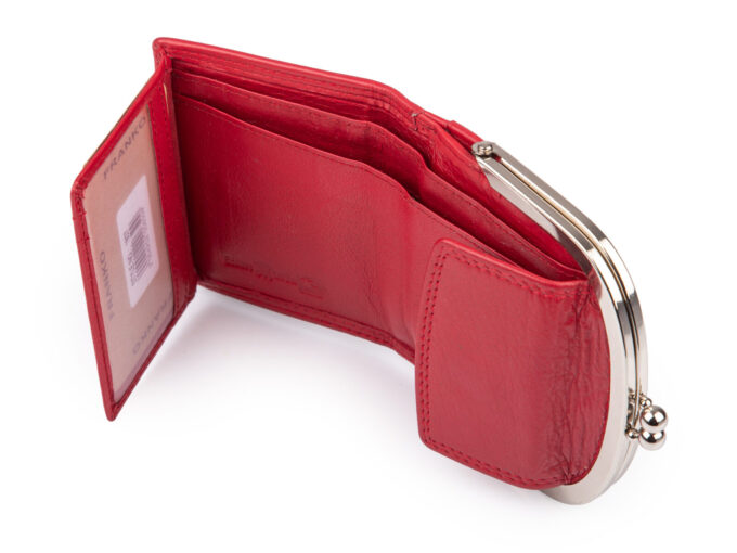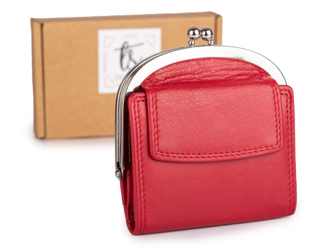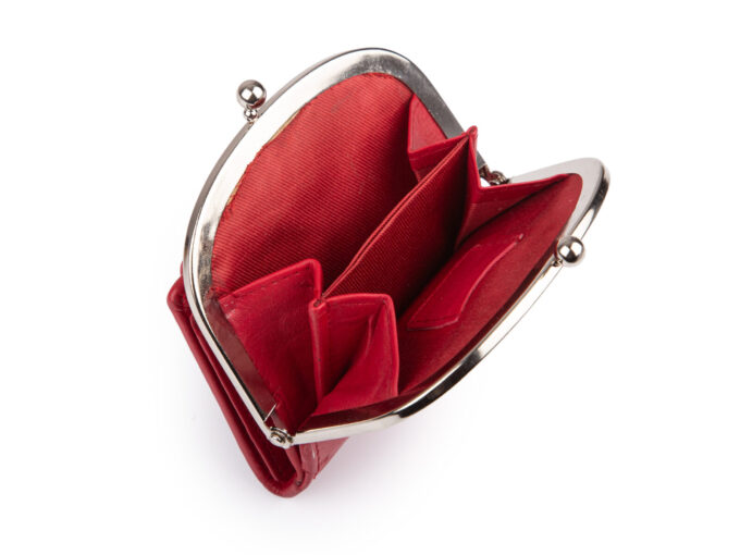 • Czerwona, skórzana, portmonetka damska zapinana na klasyczny metalowy bigiel RFID