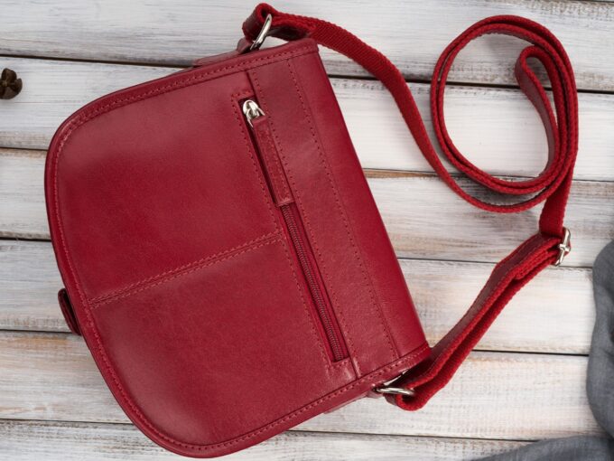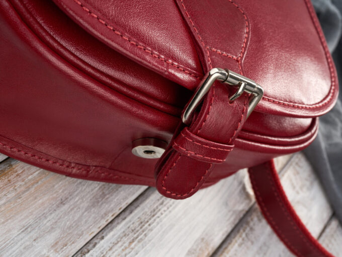 - Czerwona torebka damska skórzana, elegancka, półokrągła.