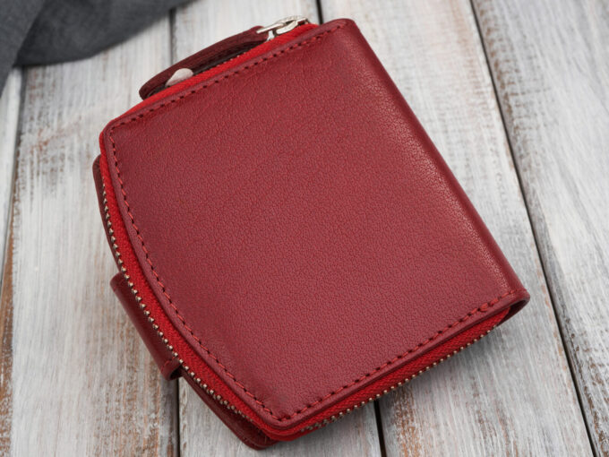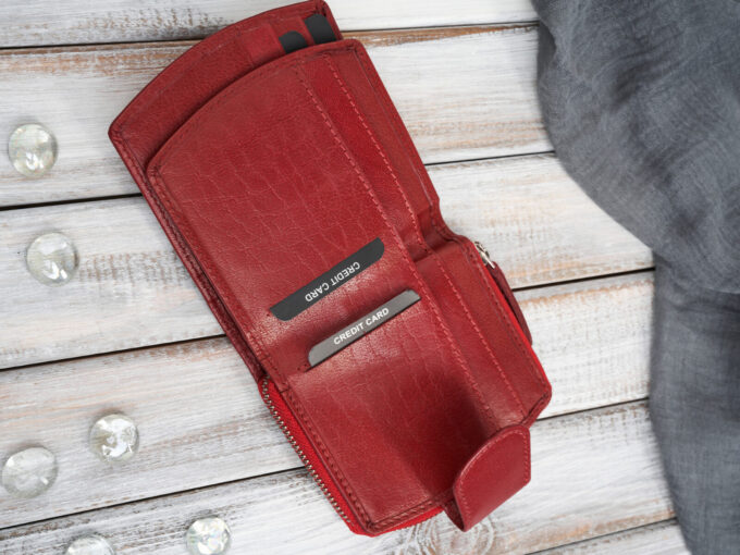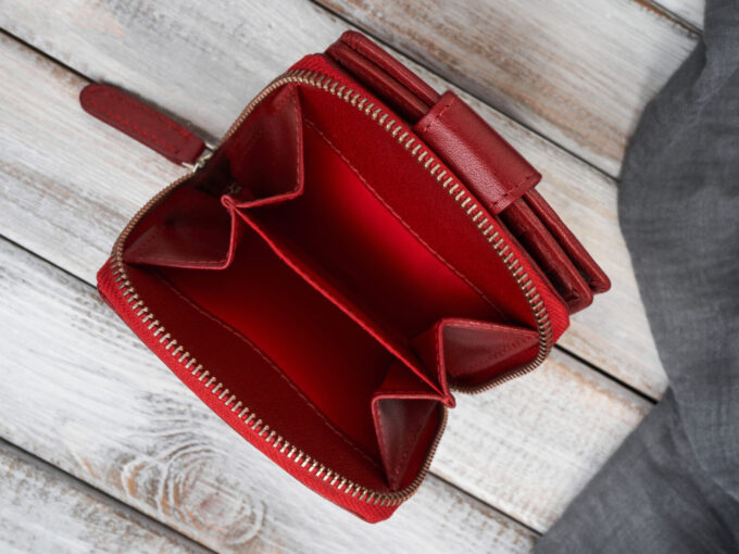 - Czerwony portfel damski skórzany średniej wielkości zapinany na zatrzask i zamek błyskawiczny.