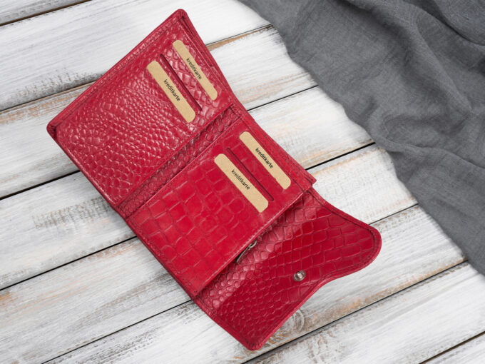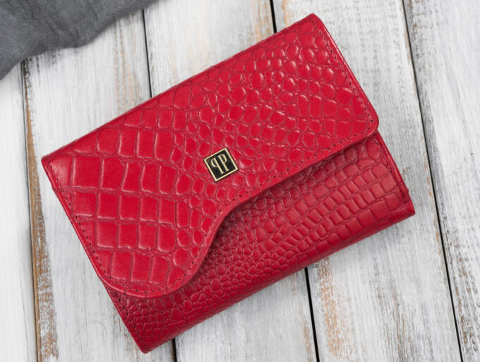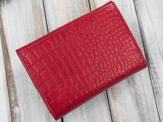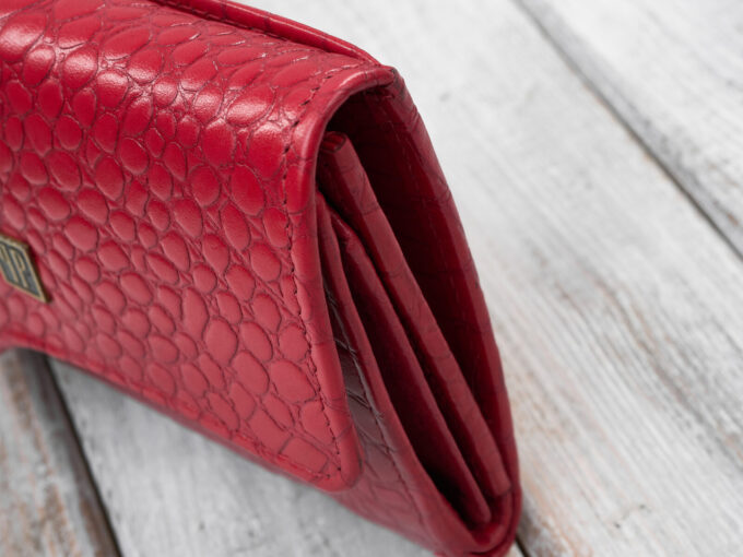 - Czerwony, średni portfel damski skórzany z wzorem imitującym skórę krokodyla.