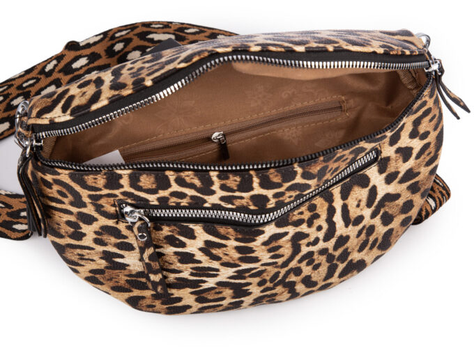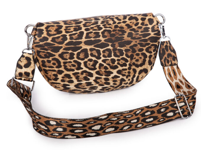 - Damska saszetka typu nerka na ramię z efektownym wzorkiem w panterkę (tzw. leopard print) w kolorze brązowym.