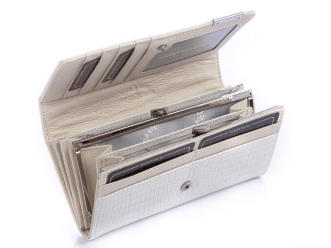 - posiada dwie przegrody na bilon zamykane na metalowy, chromowany bigiel wewnątrz portfela.