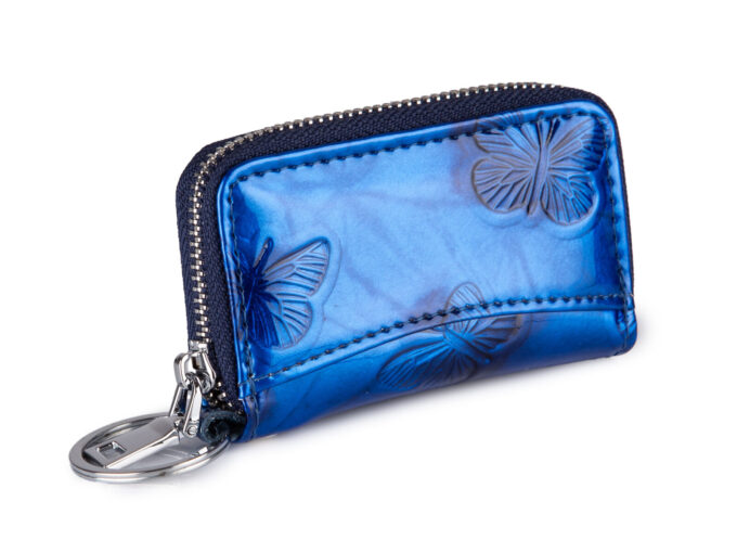 - Damskie etui na klucze, lakierowane, niebieskie z tłoczeniem w motylki.