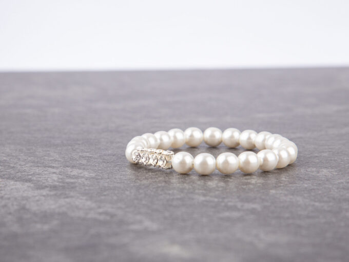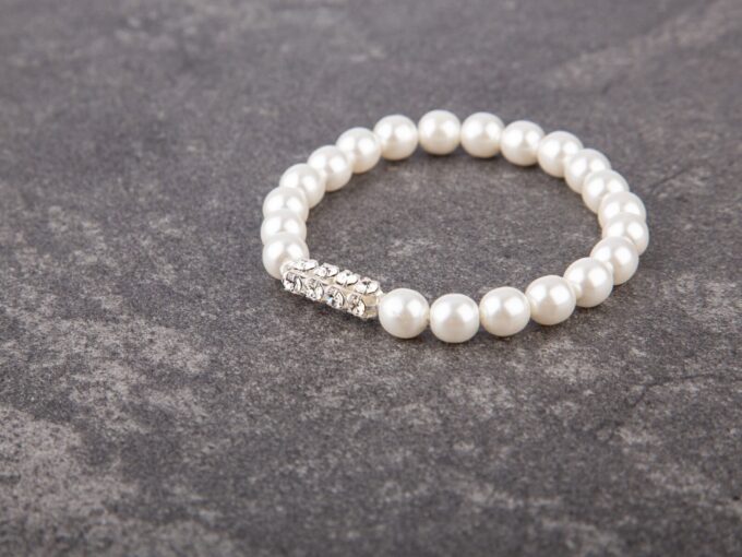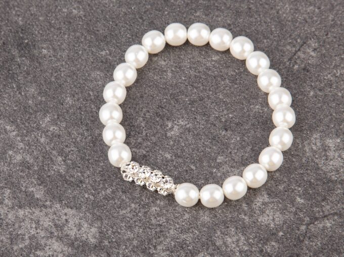 Bransoletkę wykonano z równych, błyszczących perełek Preciosa w kolorze białym. Centralnym punktem ozdobnym jest srebrzysty łącznik wysadzany błyszczącymi kryształowymi cyrkoniami, które pięknie mienią się w świetle i nadają całości szykownego charakteru. Elastyczna konstrukcja sprawia, że bransoletka łatwo dopasowuje się do nadgarstka, zapewniając wygodę noszenia. Idealna zarówno do używania na co dzień, jak i na wyjątkowe okazje. Pasuje do eleganckich sukienek, wieczorowych kreacji, może także stanowić subtelny dodatek do klasycznych stylizacji biznesowych.