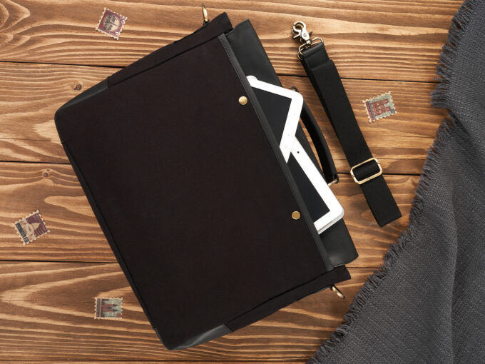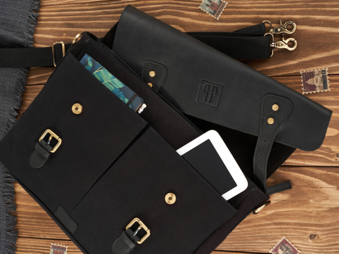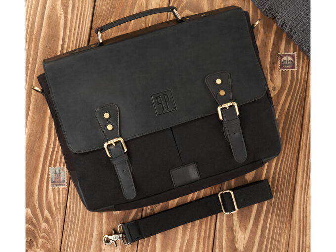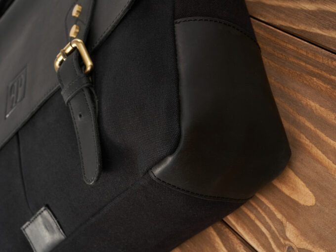 - Duża, czarna, teczka męska uszyta z mocnego canvasu i grubej, wołowej skóry naturalnej w stylu vintage.