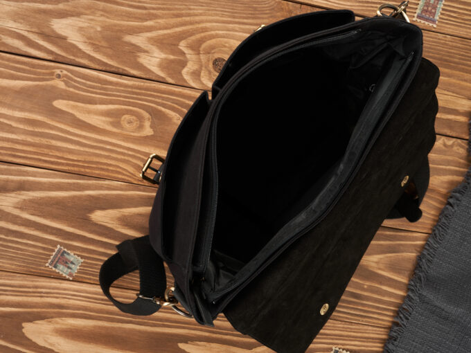 - Szeroka klapa zapinana jest za pomocą dwóch skórzanych pasków ze sprzączkami. Dodatkowo, klapa jest zapinana na dwa, metalowe guziczki magnetyczne.