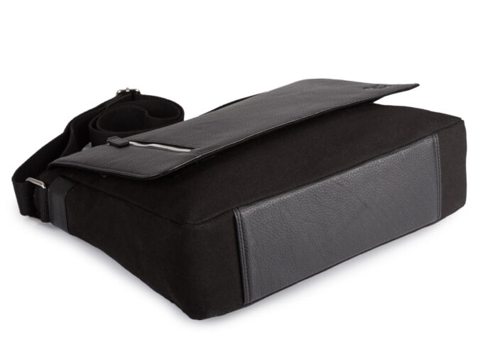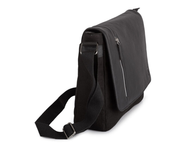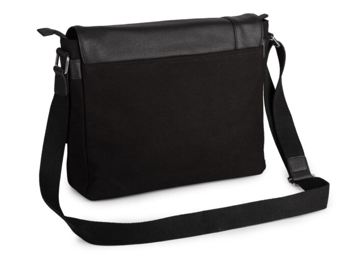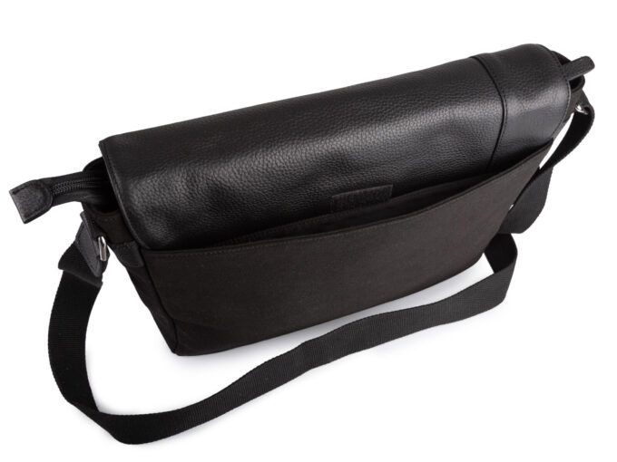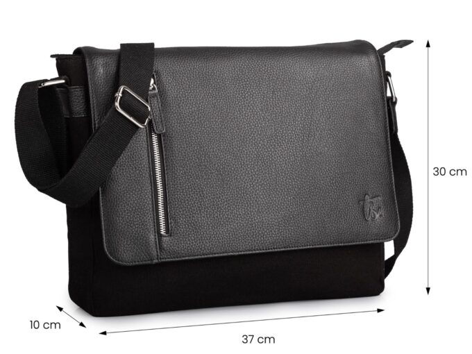 Duża czarna torba męska na ramię z canvasu i skóry naturalnej z klapą Sergej