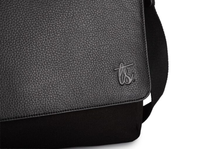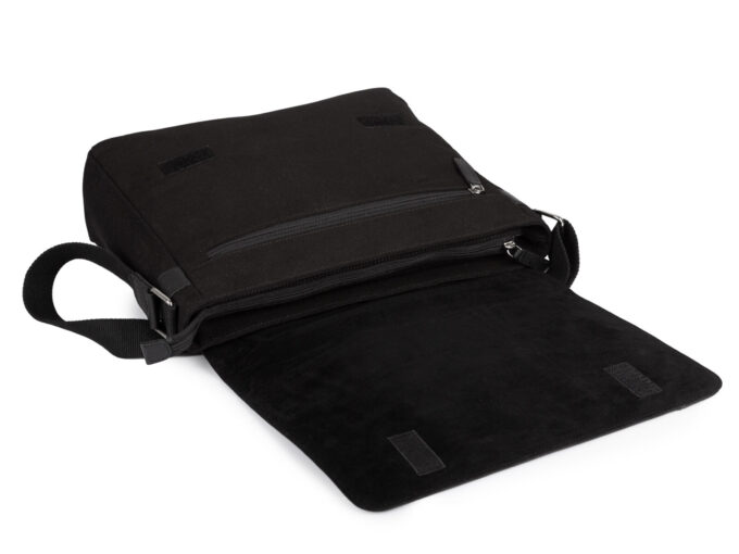 Duża, czarna torba męska na ramię marki Sergej, ręcznie uszyta z wytrzymałego canvasu i naturalnej skóry floater z wytłoczonym logo na klapie, mieści format A4 i oferuje przemyślane wnętrze z organizerem i wieloma kieszeniami (w tym pionową kieszonką na klapie i suwakiem pod klapą), bezpieczne zapięcie na dwa rzepy, regulowany pasek oraz wzmocnione skórzane dno — idealna do pracy i na studia. Pełna specyfikacja ⬇