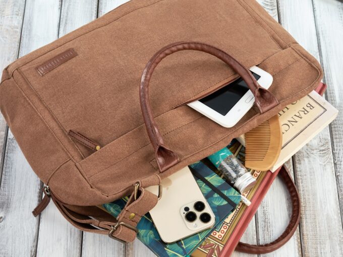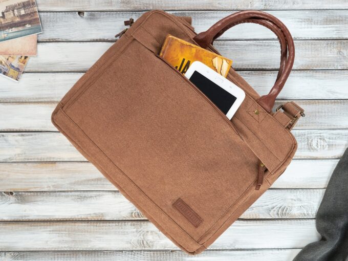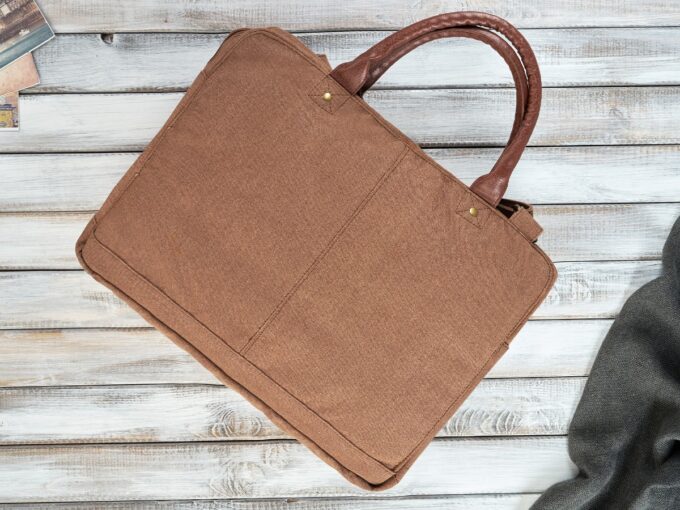 - Duża, elegancka, materiałowa torba męska do pracy w kolorze brązowym.