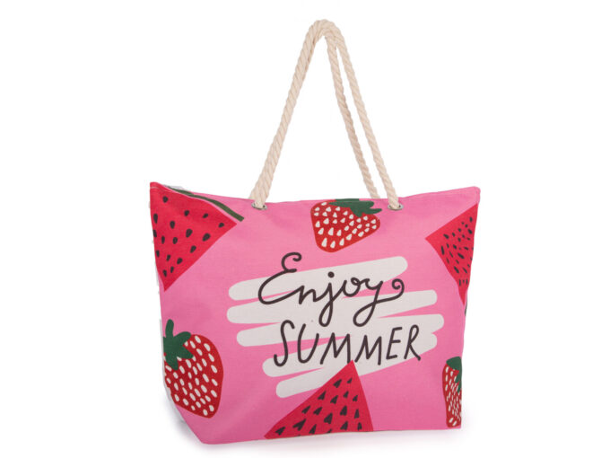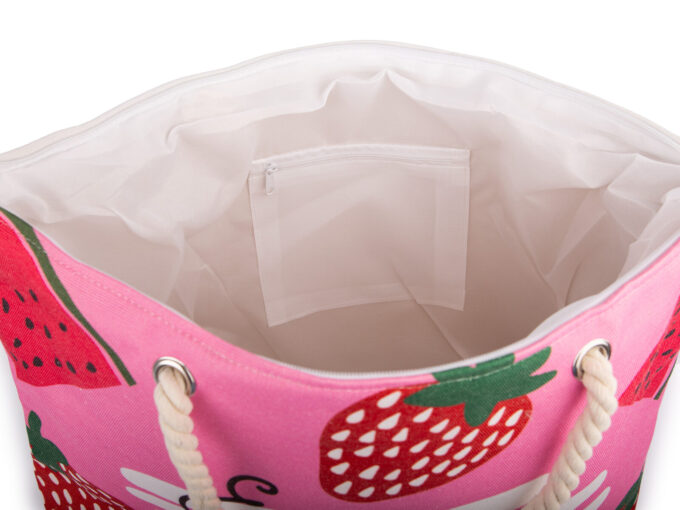 - Różowa, duża torba plażowa z kolorowym, wakacyjnym wzorem w owoce (truskawki i arbuzy).