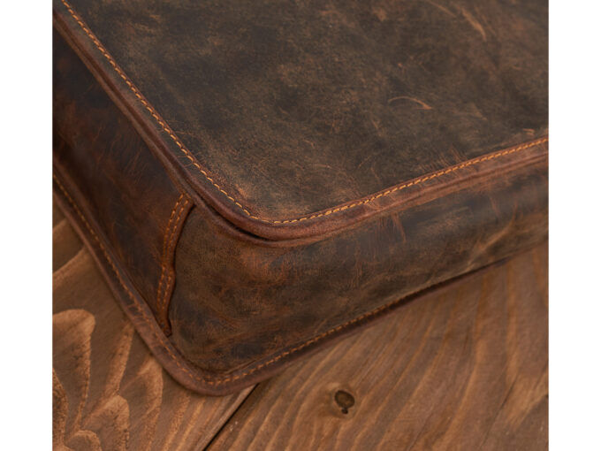 - Uszyta z grubej, wysokogatunkowej skóry naturalnej wołowej w stylu vintage (stylizowana na postarzaną w procesie produkcyjnym).