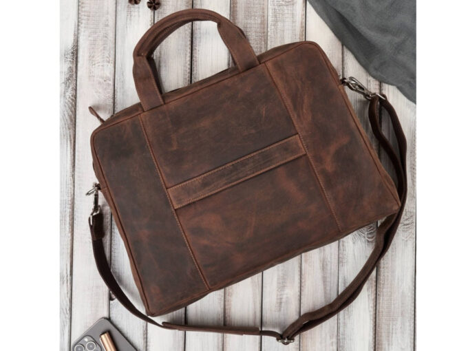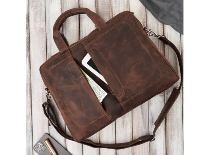 Duża, kasztanowa torba męska Paolo Peruzzi z grubiej, postarzonej skóry naturalnej — elegancka i pojemna, zmieści dokumenty A4 oraz laptop 14–15,6 cali (36×27×5 cm), ma zamykaną na zamek główną komorę z wyściełaną przegrodą na laptop, organizer i dwie frontowe kieszenie na zamek, uchwyt do montażu na walizce oraz odpinany, regulowany pasek na ramię. Pełna specyfikacja ⬇