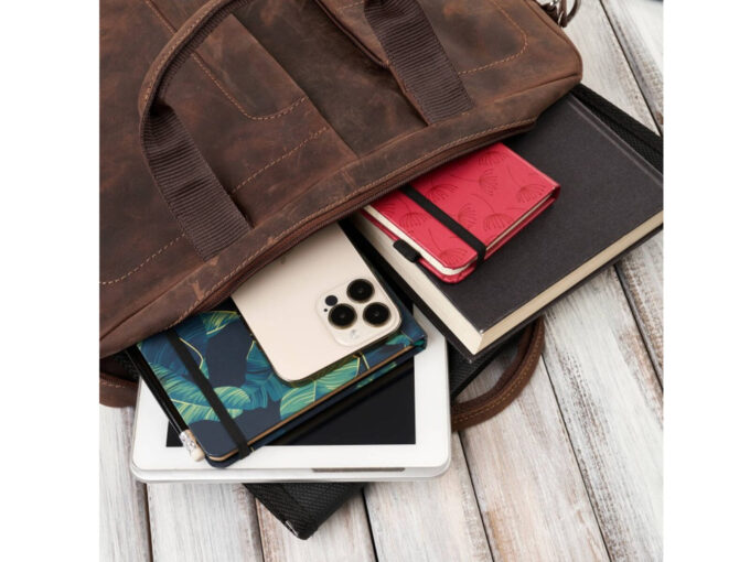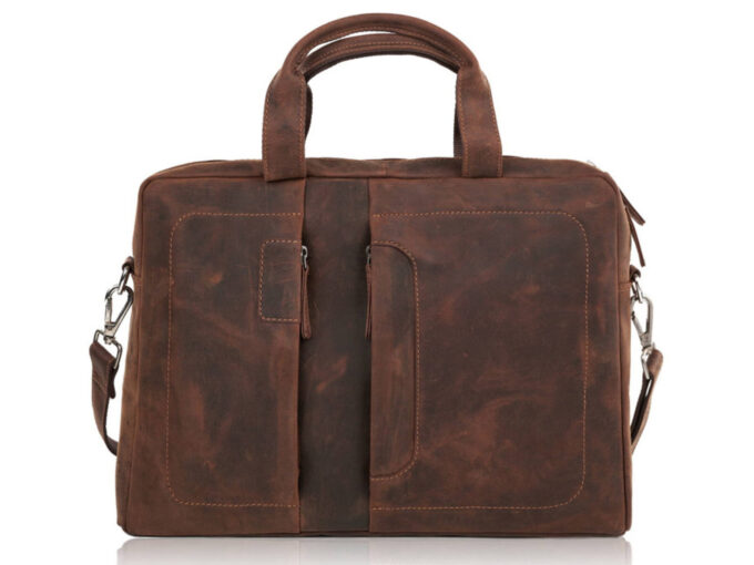 • Duża torba męska skórzana w kolorze brązowym (głęboki, kasztanowy odcień).