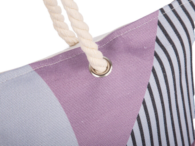 - Kolorowa, duża torba plażowa z fioletowym wzorem geometrycznym.