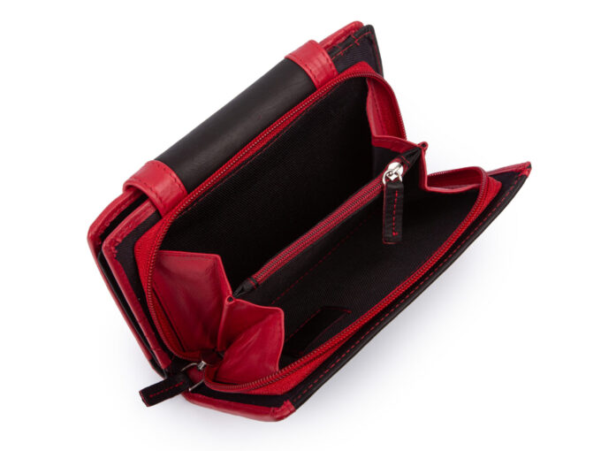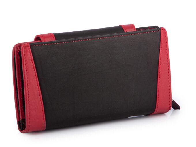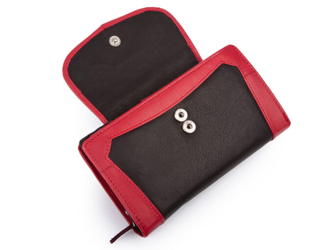 - Duży, czarno-czerwony, portfel damski z miękkiej skóry naturalnej.
