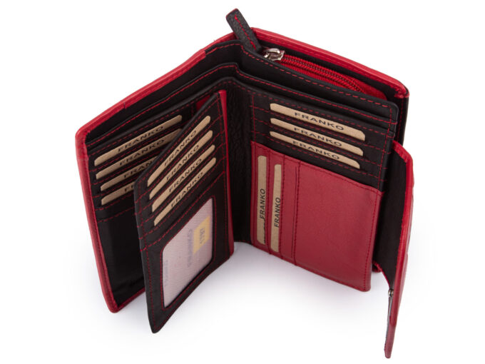 Duży, czarno-czerwony portfel damski marki Franko to doskonały wybór dla pań, które szukają pojemnego portfela który pomieści wszystkie potrzebne karty płatnicze i lojalnościowe w jednym miejscu. Dzięki miękkiej skórze naturalnej jest przyjemny w dotyku, a jednocześnie trwały i odporny na intensywne użytkowanie. Duża ilość kieszonek i przegródek sprawia, że wszystkie karty, dokumenty i pieniądze mają swoje miejsce i są zawsze pod ręką. Portfel sprawdzi się zarówno w codziennym użytkowaniu, jak i podczas podróży, gdzie organizacja i szybki dostęp do niezbędnych rzeczy mają ogromne znaczenie.