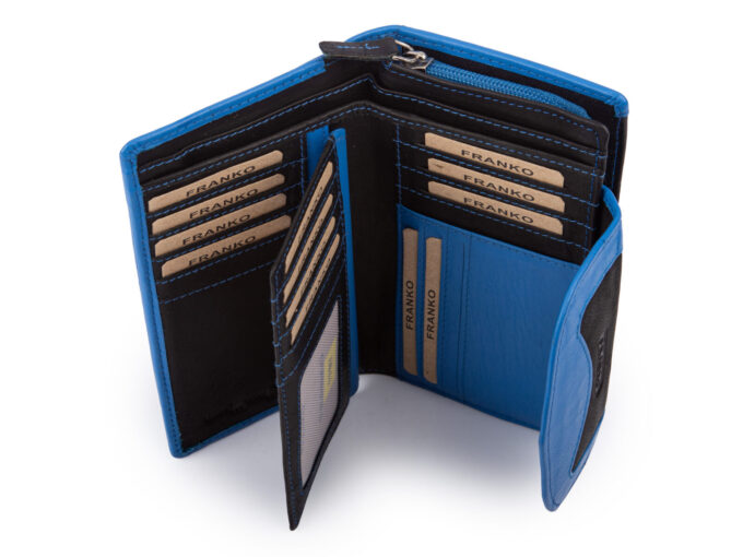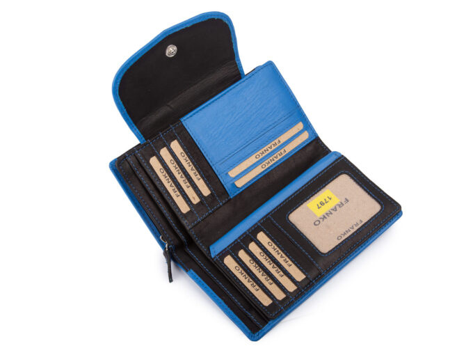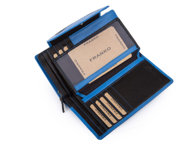 Duży, czarno-niebieski portfel damski marki Franko to doskonały wybór dla pań, które szukają pojemnego portfela który pomieści wszystkie potrzebne karty płatnicze i lojalnościowe w jednym miejscu. Dzięki miękkiej skórze naturalnej jest przyjemny w dotyku, a jednocześnie trwały i odporny na intensywne użytkowanie. Duża ilość kieszonek i przegródek sprawia, że wszystkie karty, dokumenty i pieniądze mają swoje miejsce i są zawsze pod ręką. Portfel sprawdzi się zarówno w codziennym użytkowaniu, jak i podczas podróży, gdzie organizacja i szybki dostęp do niezbędnych rzeczy mają ogromne znaczenie.