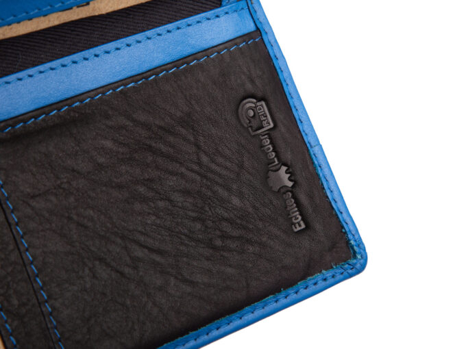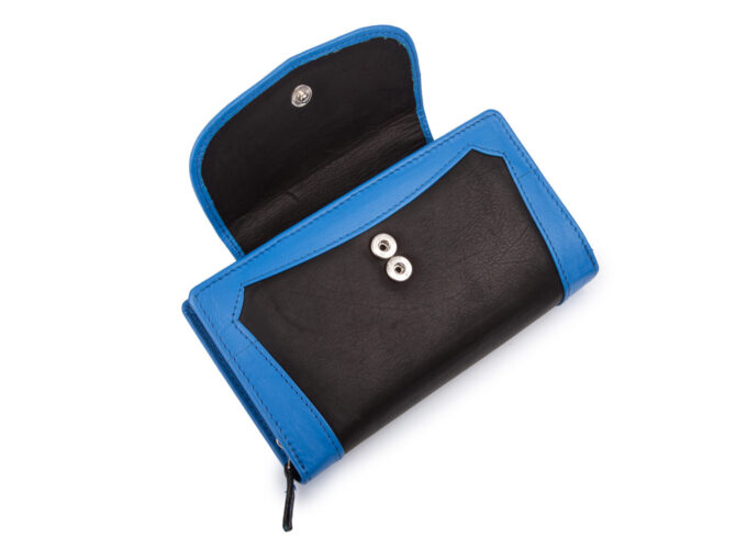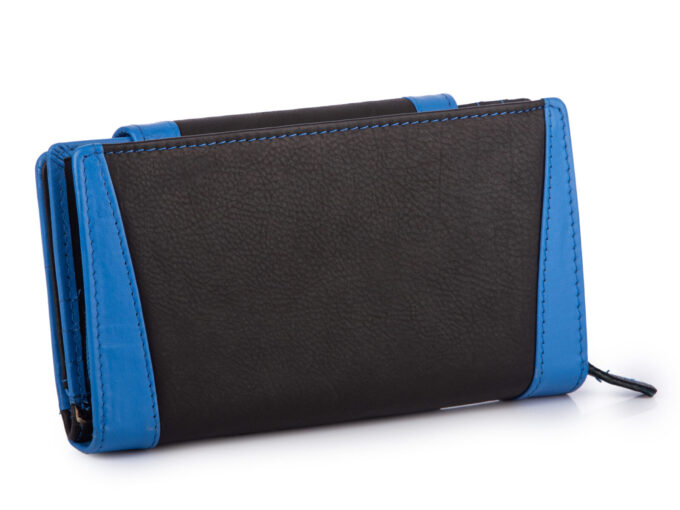 - Duży, czarno-niebieski, portfel damski z miękkiej skóry naturalnej.