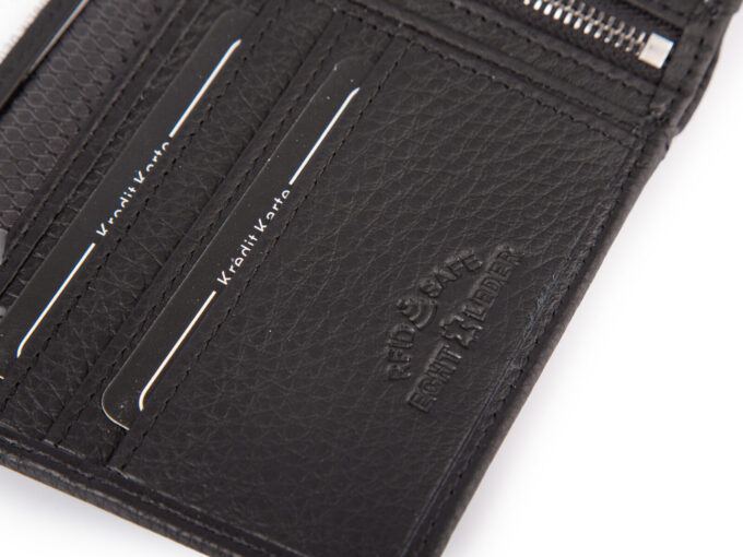 - Portfel z ochroną RFID blokujacą dostęp do kart zbliżeniowych znajdujących się w środku.