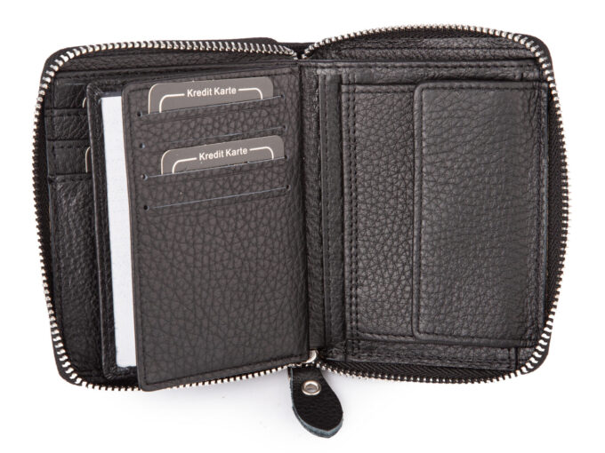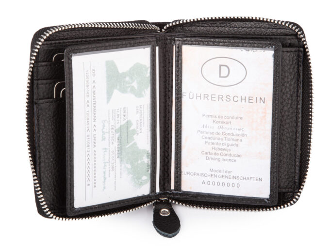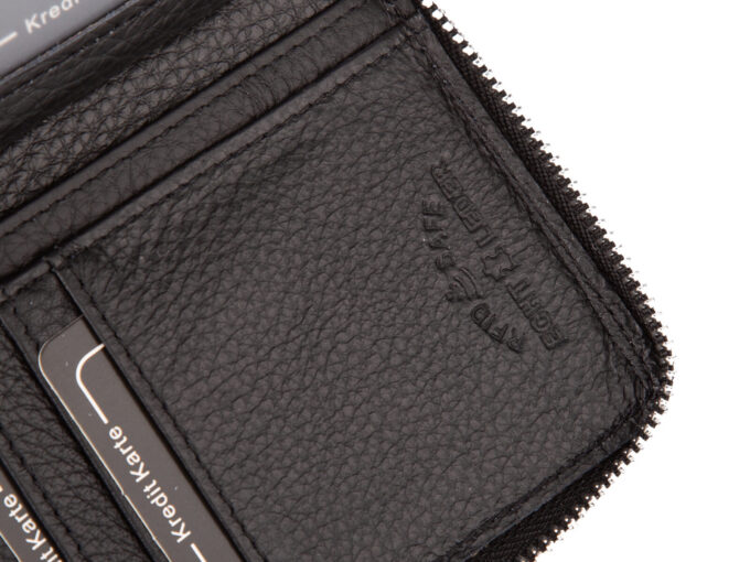 - Duży, czarny, skórzany portfel męski zapinany dookoła na zamek błyskawiczny.