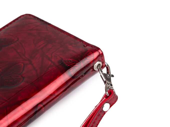 Duży czerwony portfel damski lakierowany w motylki zapinany dookoła na suwak z paskiem na rękę