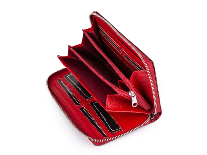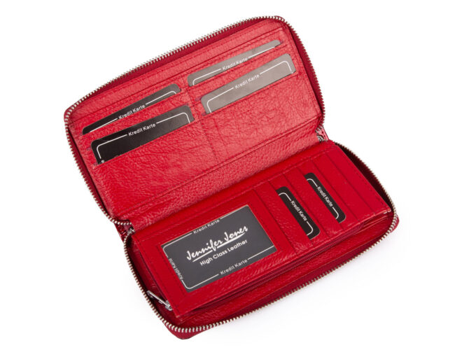 - Czerwony, duży portfel damski marki Jennifer Jones, wykonany starannie z wysokiej jakości skóry naturalnej, zapinany dookoła na zamek błyskawiczny.