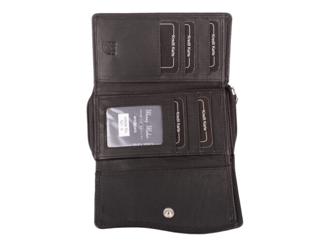 - Podzielony jest na trzy sekcje, z przodu znajduje się miejsce na karty i banknoty, na środku znajduje się pojemna kieszeń na monety, z tyłu umieszczono dodatkowy panel zapinany na zatrzask, na kolejne karty i dokumenty.