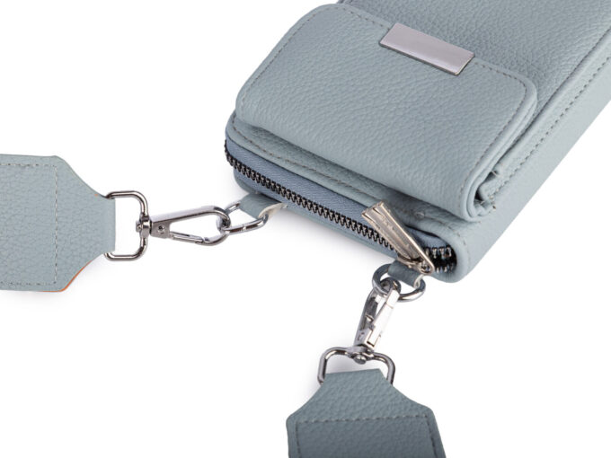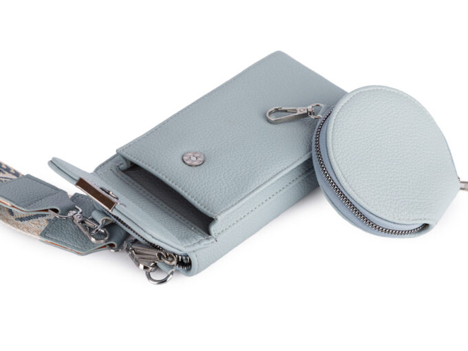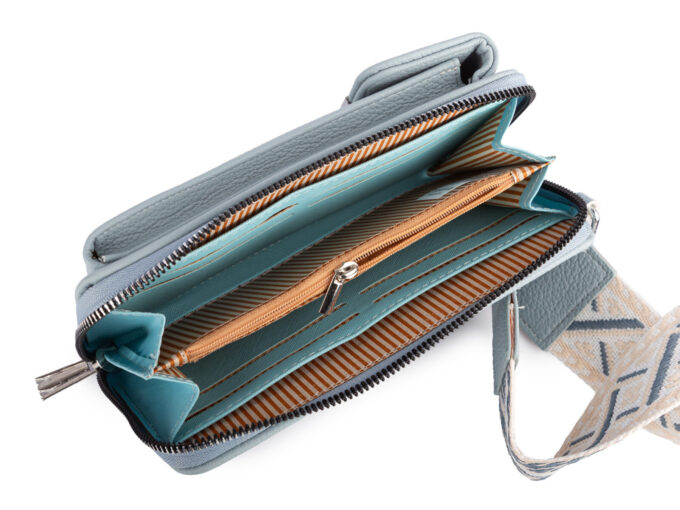 - Duży, jasnoniebieski, pionowy portfel damski z paskiem na ramię i małą saszetką.