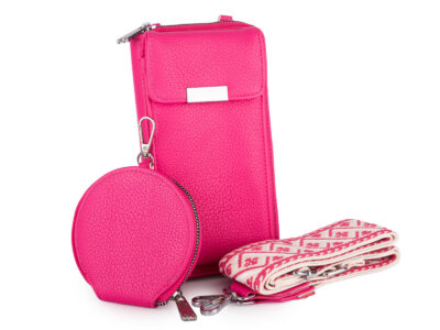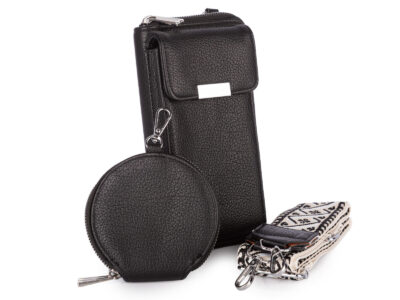 - Komplet 3w1 – w zestawie znajduje się portfel, odczepiany, długi i regulowany pasek na ramię, oraz mała, okrągła dopinana do paska saszetka zapinana na zamek błyskawiczny.