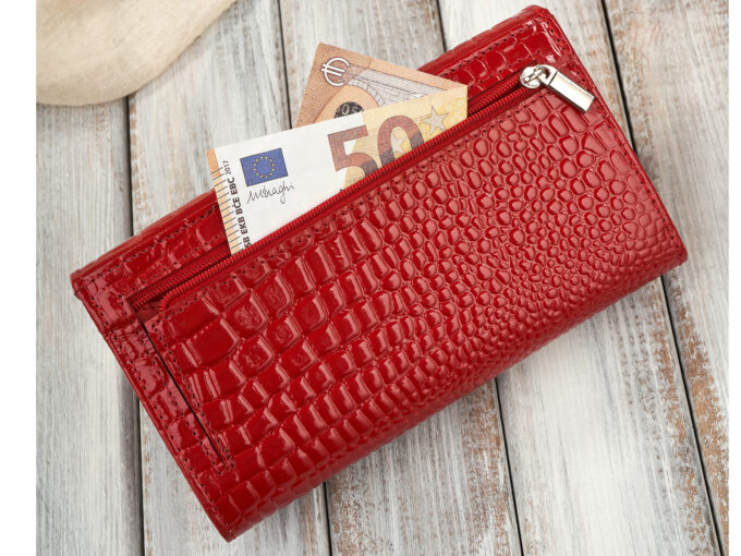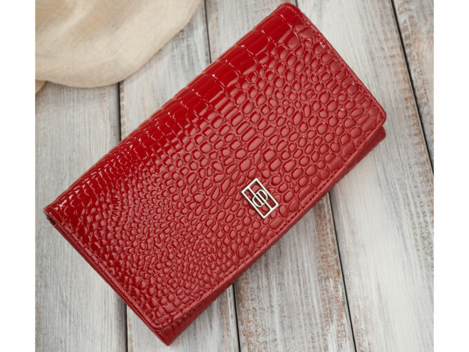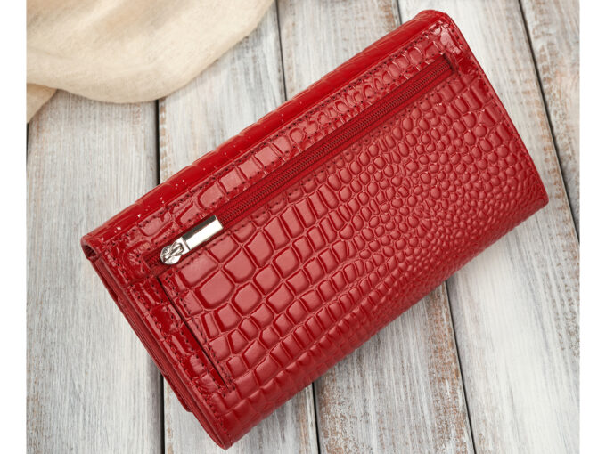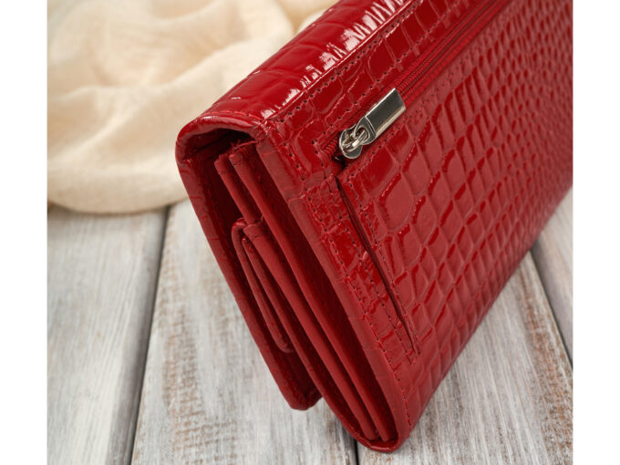 - Czerwony, duży portfel damski uszyty z lakierowanej skóry naturalnej z tłoczeniem croco imitującym wygląd skóry krokodyla.
