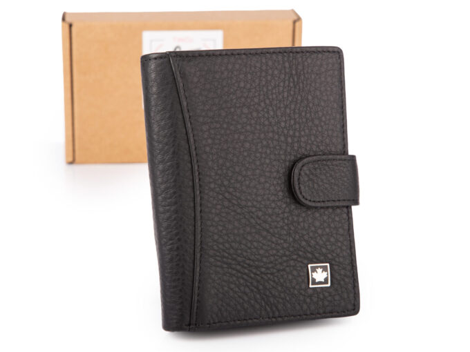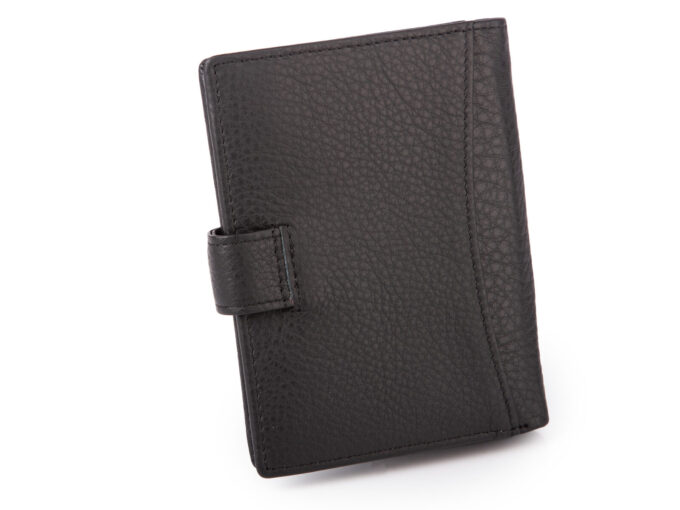 - Duży, pionowy, czarny portfel męski skórzany zapinany na zatrzask z ochroną kart RFID.