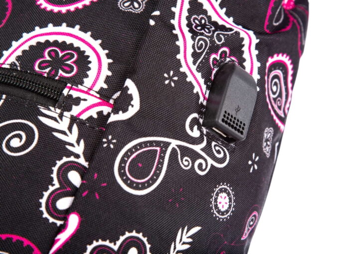 - Wewnątrz plecaka znajduje się kabel USB który po podłączeniu do powerbanka pozwoli na ładowanie telefonu komórkowego lub innego urządzenia za pomocą portu USB znajdującego się na zewnątrz (z boku plecaka). Pozwala to na wygodne ładowanie i korzystanie z urządzenia w tym samym czasie,