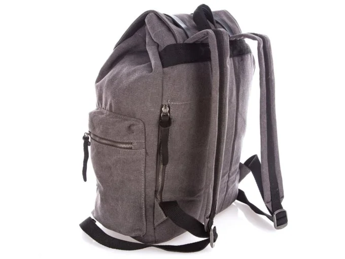 Wysokiej jakości szary, duży plecak w stylu retro / vintage. Model damski i męski, płócienny z wstawkami ze skóry naturalnej. Pełna specyfikacja ⬇