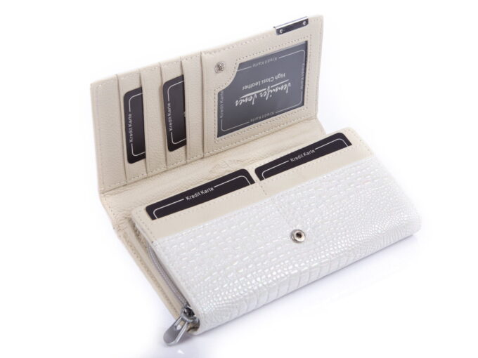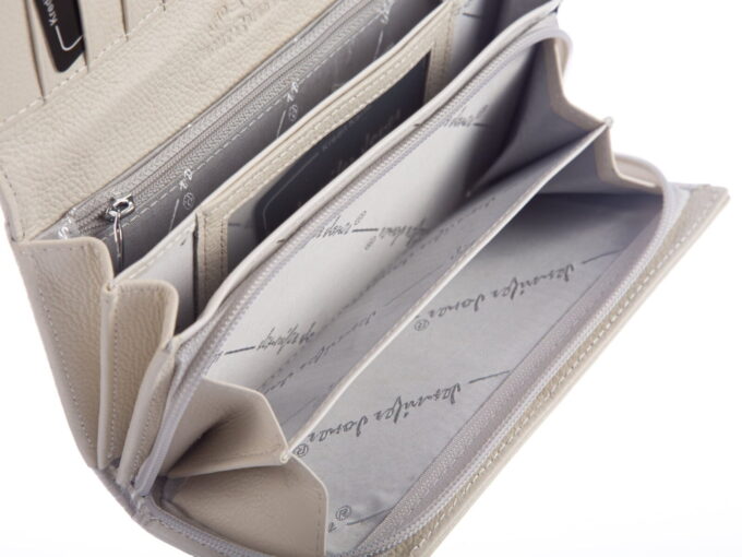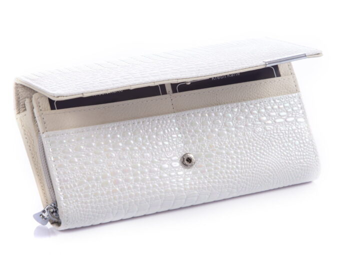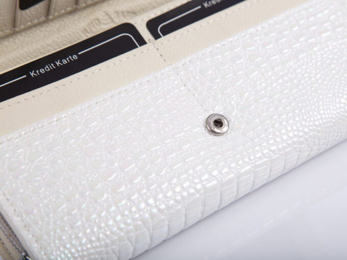 - Biały, perłowy portfel damski niemieckiej marki Jennifer Jones.