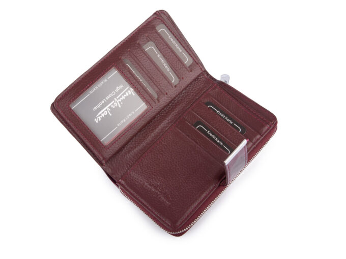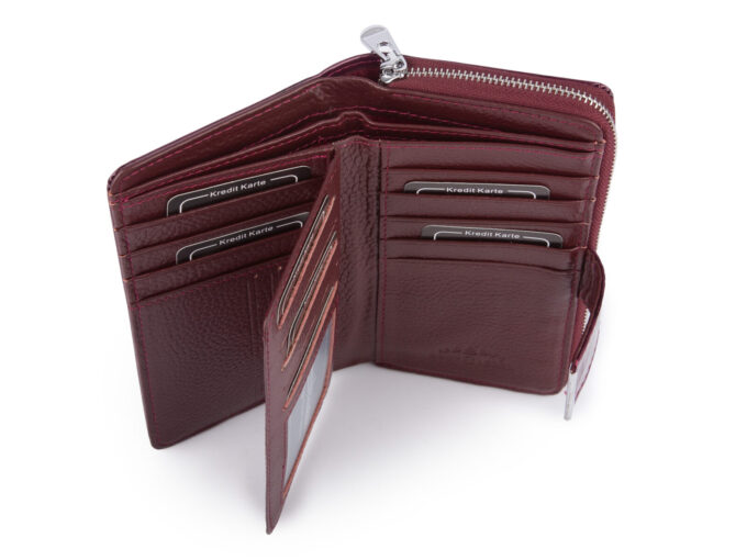 - Posiada pojemną kieszonkę na bilon z trzema przegródkami, zamykaną dookoła na zamek błyskawiczny.
