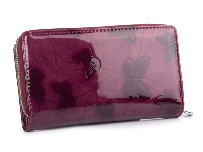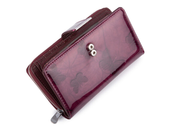- Duży, fioletowy portfel damski lakierowany zapinany na paseczek z zatrzaskiem z dużą kieszenią na monety zamykaną na metalowy zamek błyskawiczny.