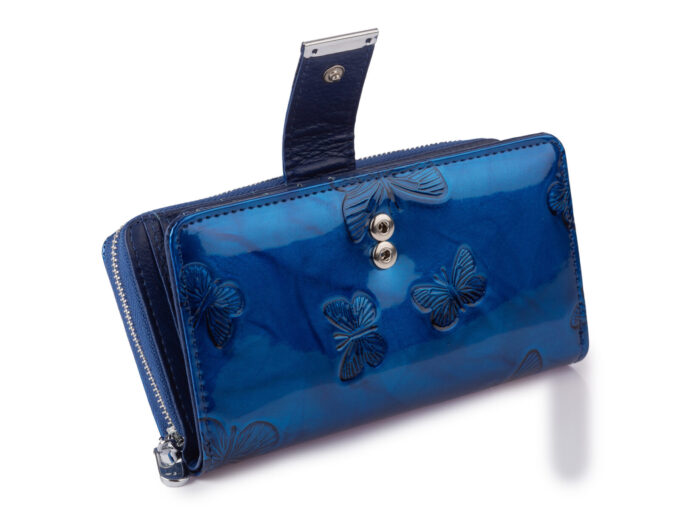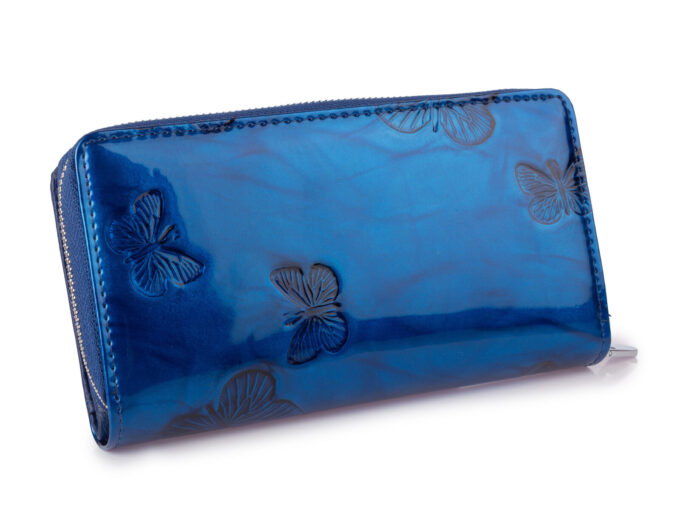 - Duży, niebieski portfel damski lakierowany zapinany na paseczek z zatrzaskiem z dużą kieszenią na monety zamykaną na metalowy zamek błyskawiczny.