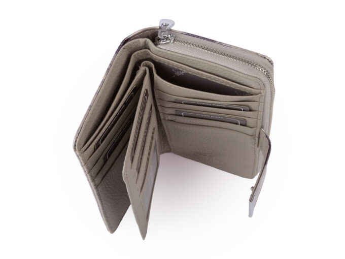 - Posiada pojemną kieszonkę na bilon z trzema przegródkami, zamykaną dookoła na zamek błyskawiczny.