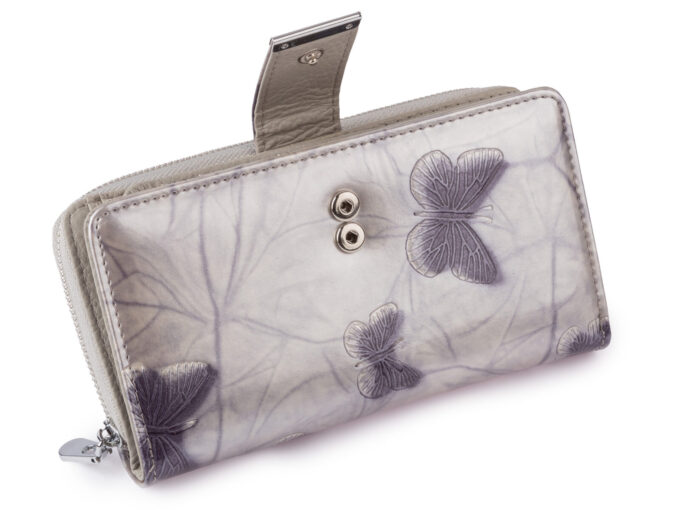 Duży portfel damski Jennifer Jones w kolorze srebrnym z motywem motylków lakierowany RFID