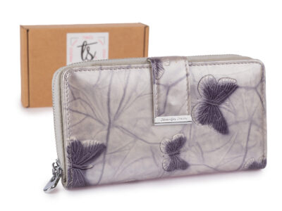 Duży portfel damski Jennifer Jones w kolorze srebrnym z motywem motylków lakierowany RFID