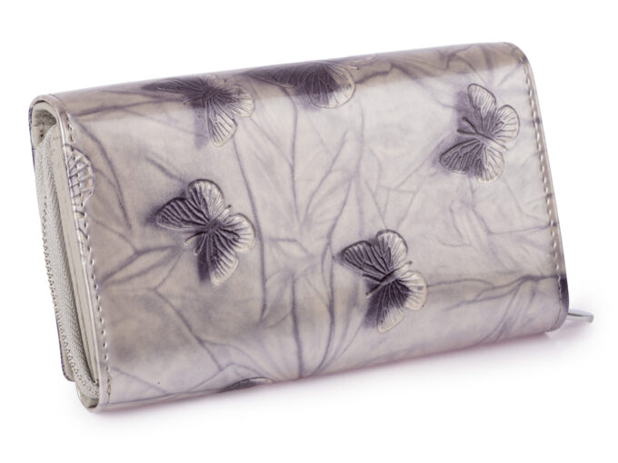 - Duży portfel damski lakierowany w kolorze srebrnym z modnym tłoczeniem w motylki.