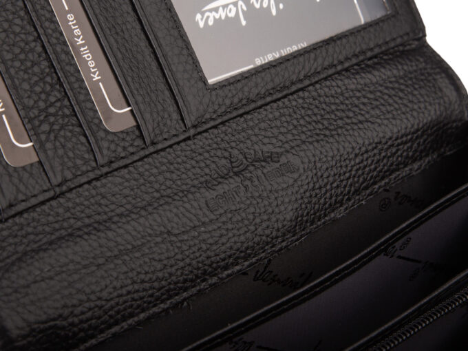 - Portfel posiada ochronę RFID. Jest to zabezpieczenie chroniące znajdujące się w portfelu karty zbliżeniowe przed dostępem z zewnątrz.
