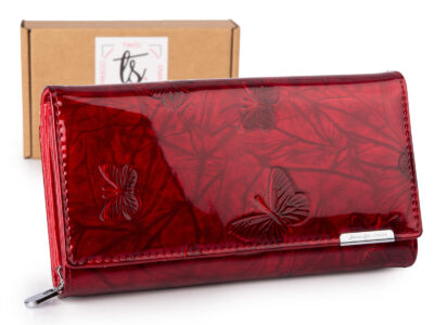 Duży portfel damski lakierowany w motylki, czerwony, skórzany z RFID