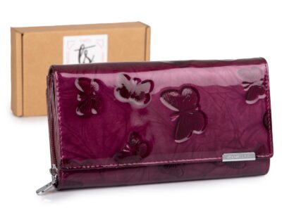 Duży portfel damski lakierowany w motylki, fioletowy, skórzany z RFID