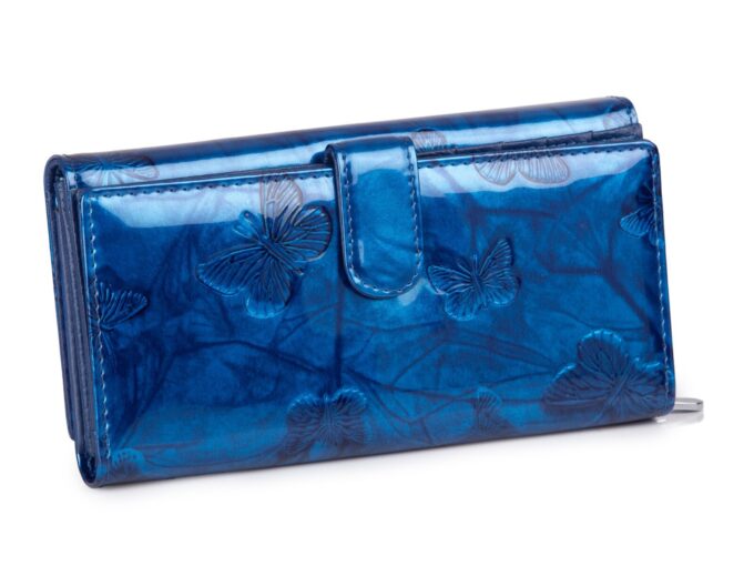 - Duży, niebieski portfel damski lakierowany z wzorem w motylki.