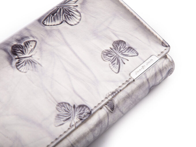 - Wykonany z wysokogatunkowej skóry naturalnej, z zewnątrz posiada tłoczenie w modne motylki. Wnętrze wykonano z przyjemnej w dotyku, gładkiej skóry naturalnej.