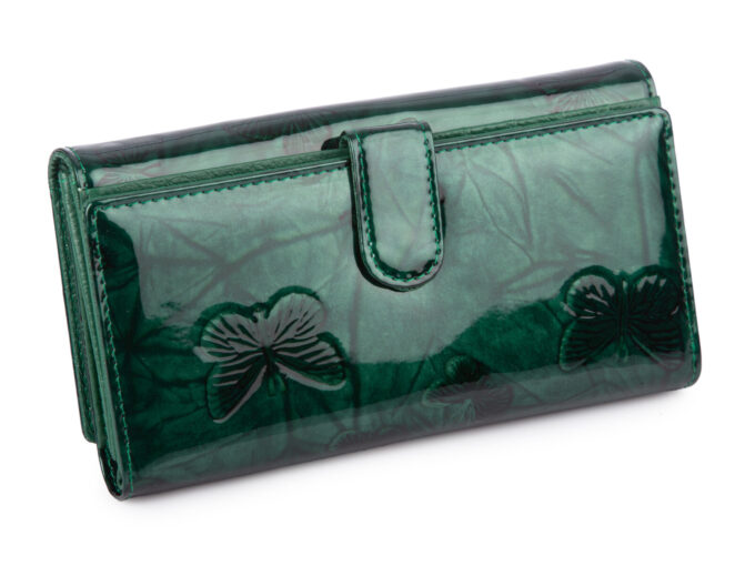 - Duży, zielony portfel damski lakierowany z wzorem w motylki.