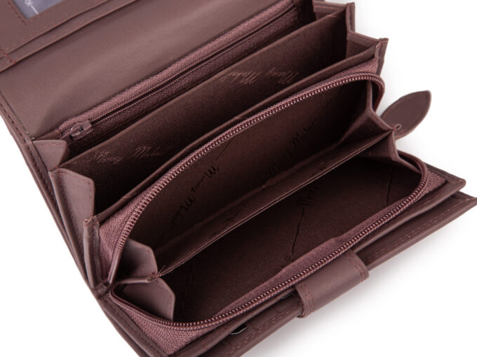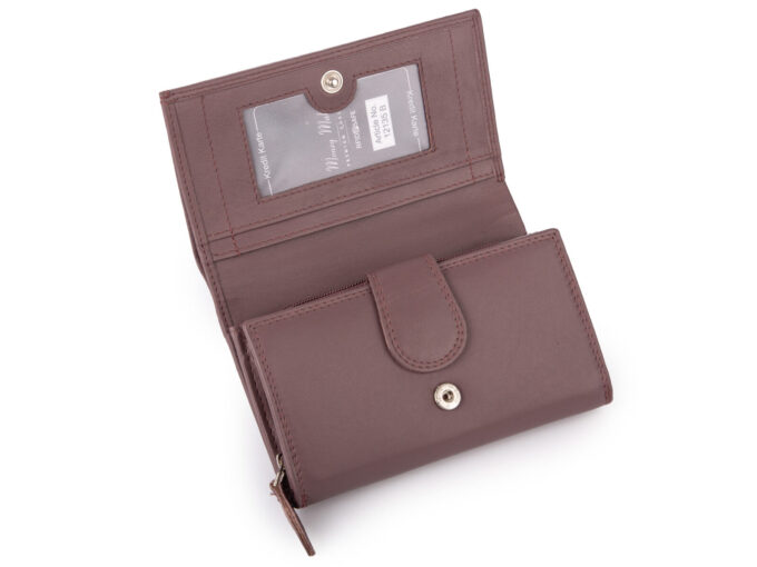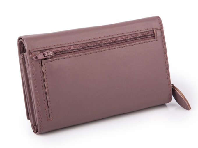 - Duży portfel damski wykonany z miękkiej i przyjemnej w dotyku skóry naturalnej w modnym kolorze mauve będący połączeniem fioletu i brązu.
