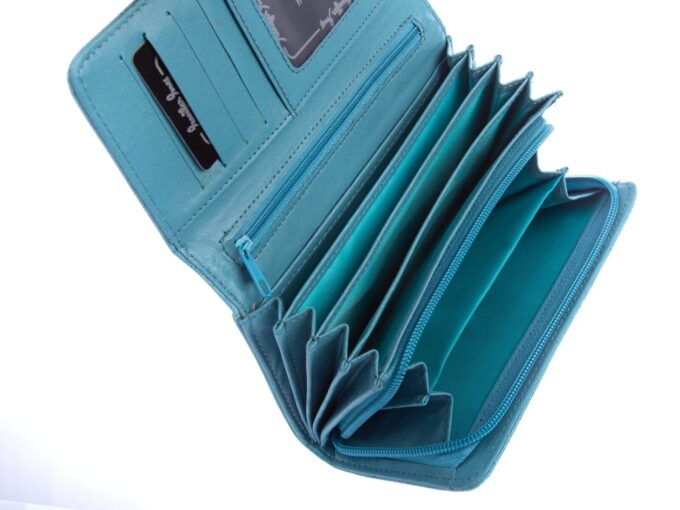 - Duży portfel damski w jasnym i pastelowym kolorze turkusowym.