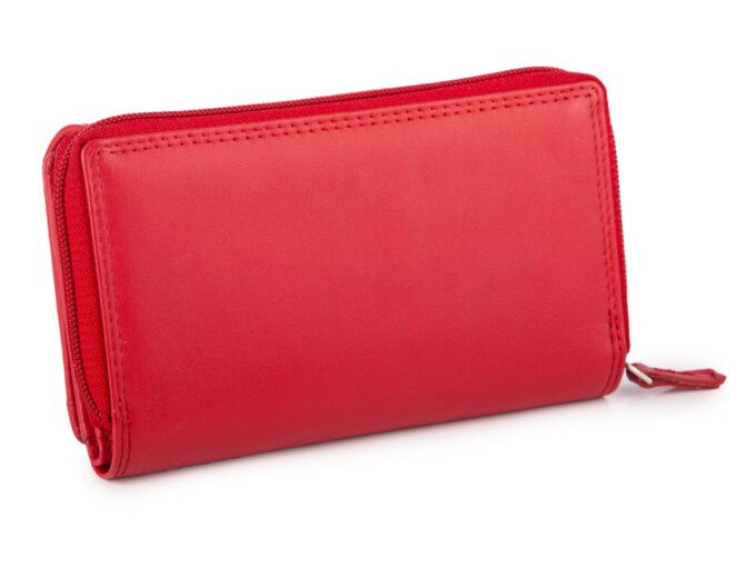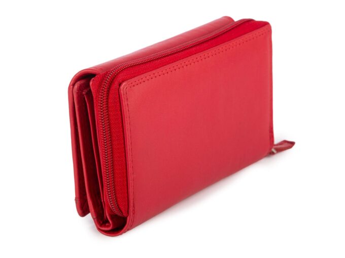 - Duży, czerwony portfel damski z miękkiej skóry naturalnej z dużą liczbą kieszonek na karty.